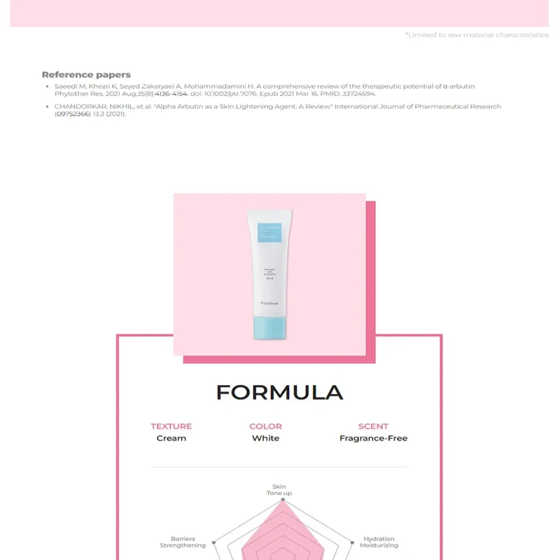 - Niacinamide: Works alongside alpha arbutin to enhance the brightening effect and smooth overall skin texture.