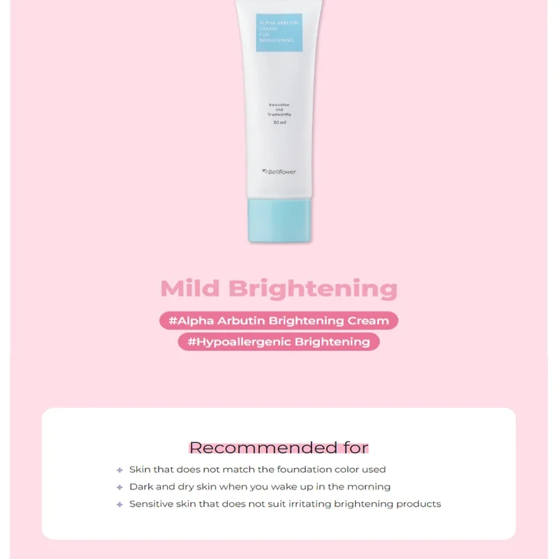 Bellflower Alpha Arbutin Cream for Brightening is a 30 ml face cream designed to fade dark spots and even out skin tone using a fragrance-free, non-sticky formula.