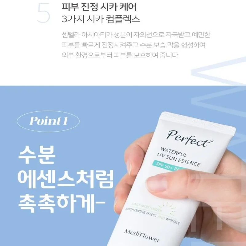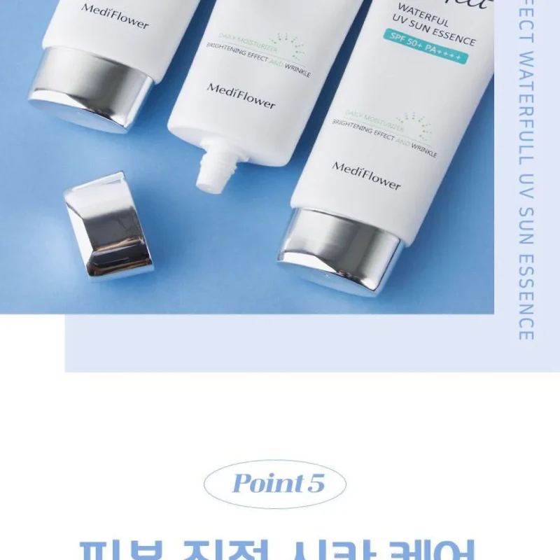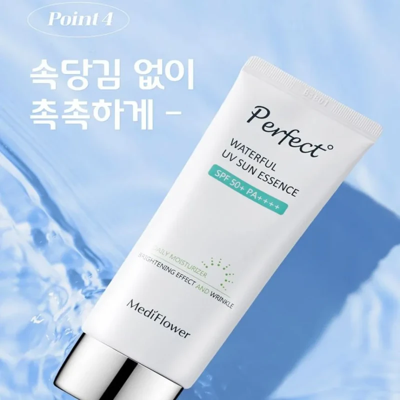 MediFlower Perfect Waterful UV Sun Essence is a must-have for your skincare routine. It offers broad-spectrum protection against UVA and UVB rays. This helps prevent early signs of aging, like wrinkles and sunspots, by blocking environmental damage.